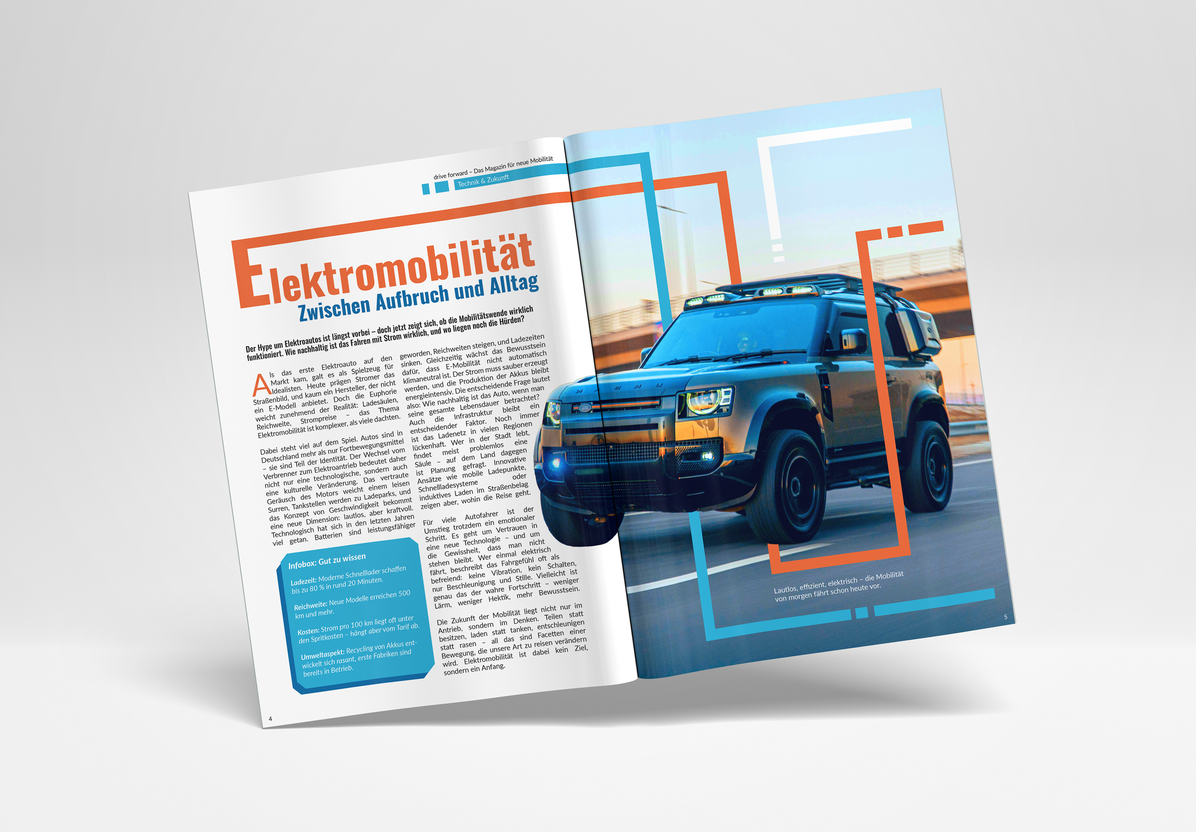Die Doppelseite kombiniert starke Typografie mit klaren Farbkontrasten für einen modernen, dynamischen Look. Das Layout verbindet Text und Bild durch überlappende Linien, die Bewegung und technischen Fortschritt vermitteln. Die Fotografie des Fahrzeugs bricht bewusst aus dem Raster aus und erzeugt so Tiefe und Aufmerksamkeit.